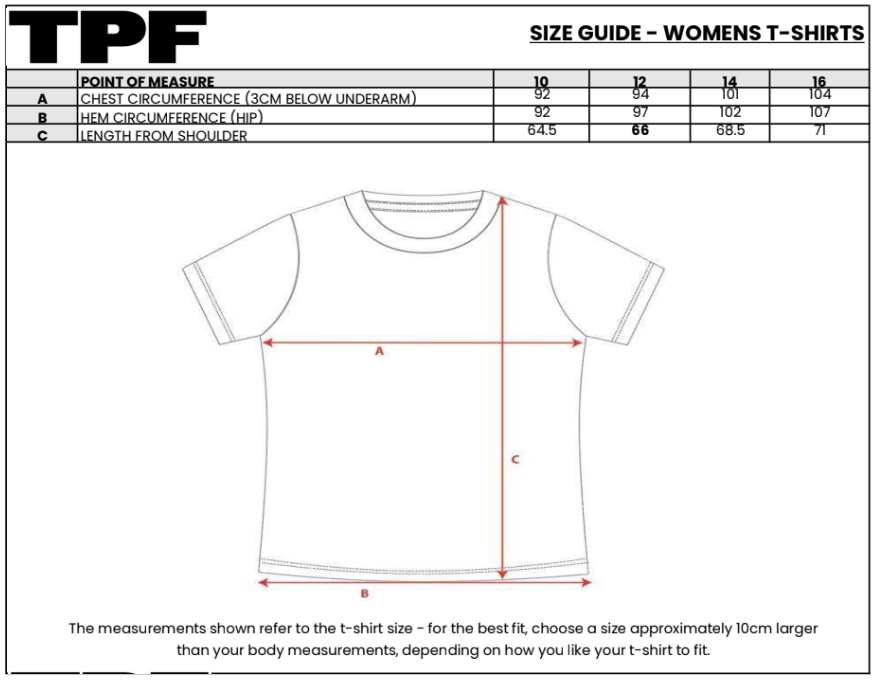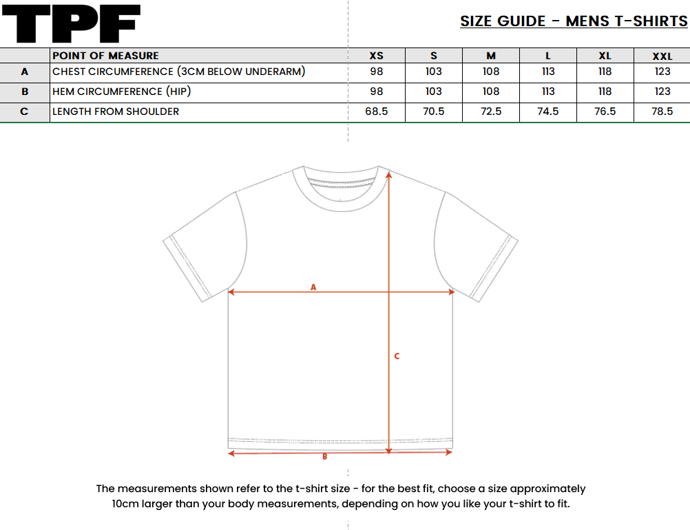 Sizes for the Powercor Lorne Pier to Pub and Mountain to Surf complimentary Event T Shirts: